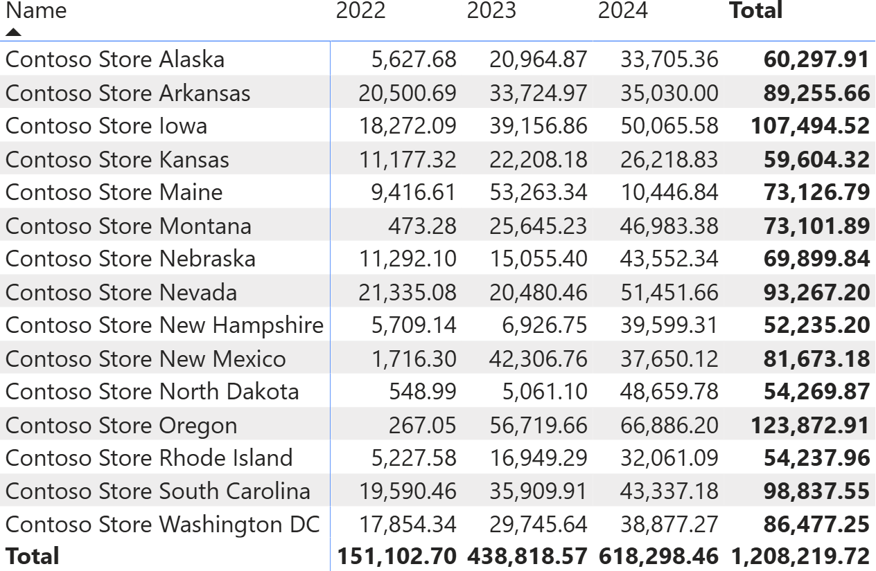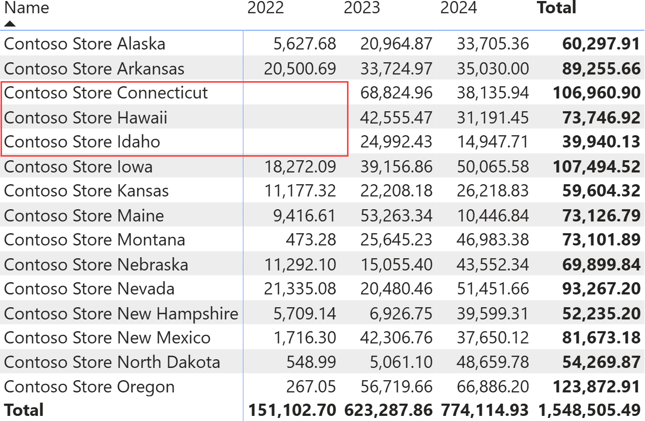 The goal of the pattern is to show the sales amount for only the stores that were open across all the years analyzed. In the next report, you will see that several stores (Connecticut, Hawaii, and Idaho) were not open in 2022; therefore, following the pattern, they should not participate in the comparison.