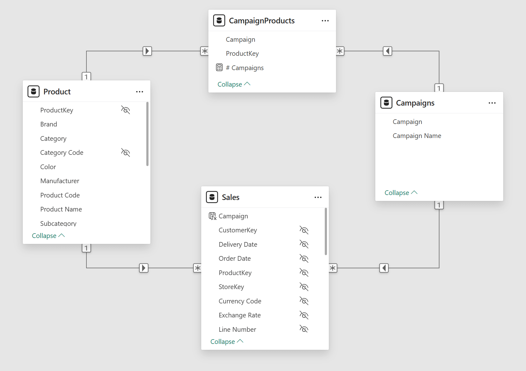 This article presented a pattern for measuring campaign effectiveness beyond direct attribution. The solution relies on a many-to-many relationship between products and campaigns, implemented through a bridge table, combined with the selective use of CROSSFILTER to control how filters propagate through the model.