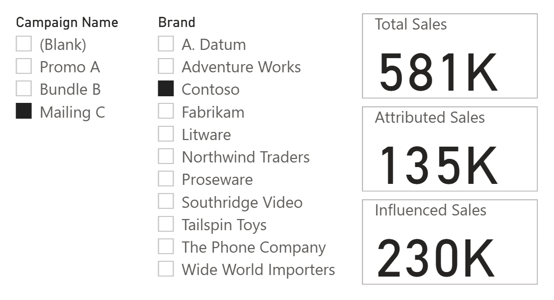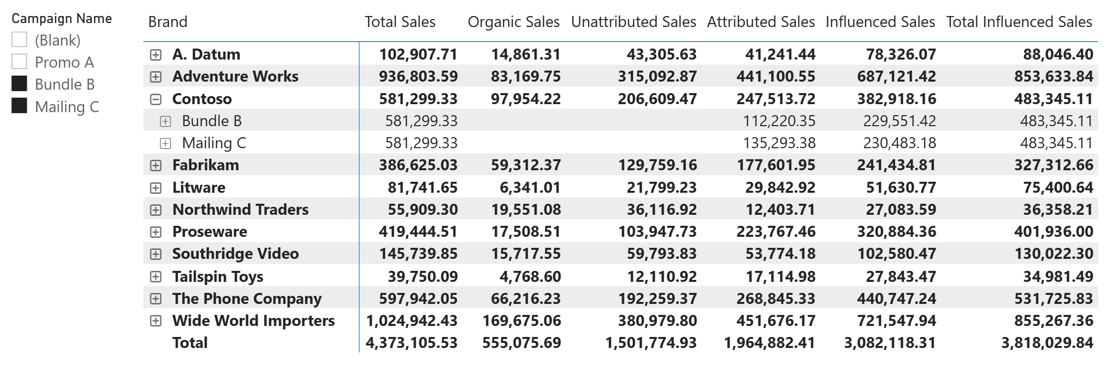 The report shows all measures together for two campaigns: Bundle B and Mailing C. At the brand level (like Contoso), each measure provides a distinct perspective. Total Sales shows overall revenue regardless of campaign filters. Organic Sales isolates products outside any campaign, serving as a baseline for non-promoted performance. Unattributed Sales captures transactions with no campaign link, displayed even though specific campaigns are selected in the slicer. Attributed Sales shows revenue directly tracked to the selected campaigns, while Influenced Sales expands this to include all sales of products participating in those campaigns. Total Influenced Sales provides a reference across all campaigns, which helps identify whether products in the selected campaigns also belong to other campaigns.