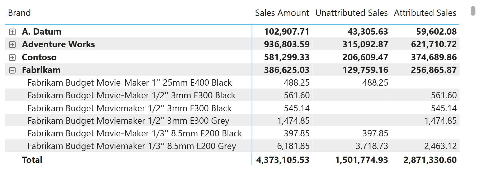 This pattern makes Total Sales a helpful reference point. When analyzing a specific campaign, you can compare Attributed Sales against Total Sales to understand what fraction of overall brand revenue came through that campaign. The measure provides a stable context regardless of the filtered campaigns.