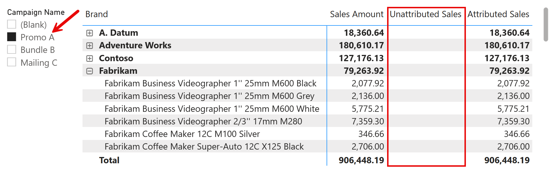 The measure filters Sales Amount to include only transactions where the Campaigns[Campaign] column is not blank, meaning a campaign was explicitly used for the sale. By checking Campaigns[Campaign] rather than Sales[Campaign], we ensure that transactions assigned to unavailable campaigns are included. If you use Sales[Campaign] instead, data quality issues will result in numbers that do not correspond to Sales Amount by summing the following Unattributed Sales measure.