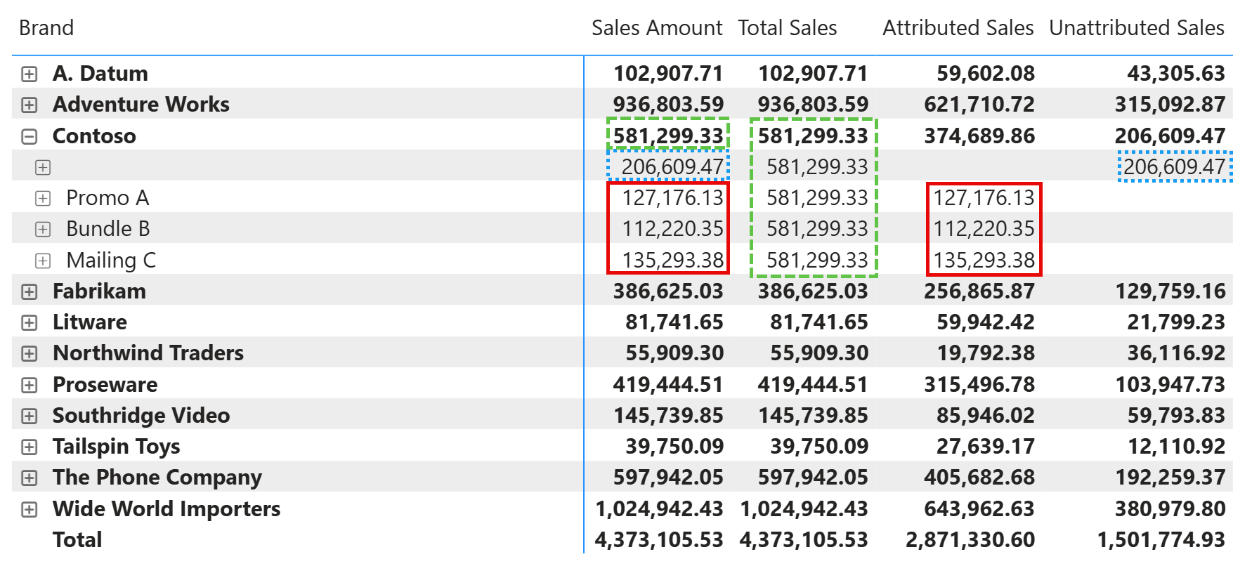 When we expand Contoso to see individual campaigns, the behavior diverges. The blank row (highlighted with a green dashed border) represents unattributed sales: Sales Amount shows 206,609.47, while Total Sales remains at 581,299.33. For the individual campaigns (Promo A, Bundle B, and Mailing C, highlighted with red solid borders), Sales Amount shows only the transactions attributed to each campaign, while Total Sales consistently displays the brand total of 581,299.33.