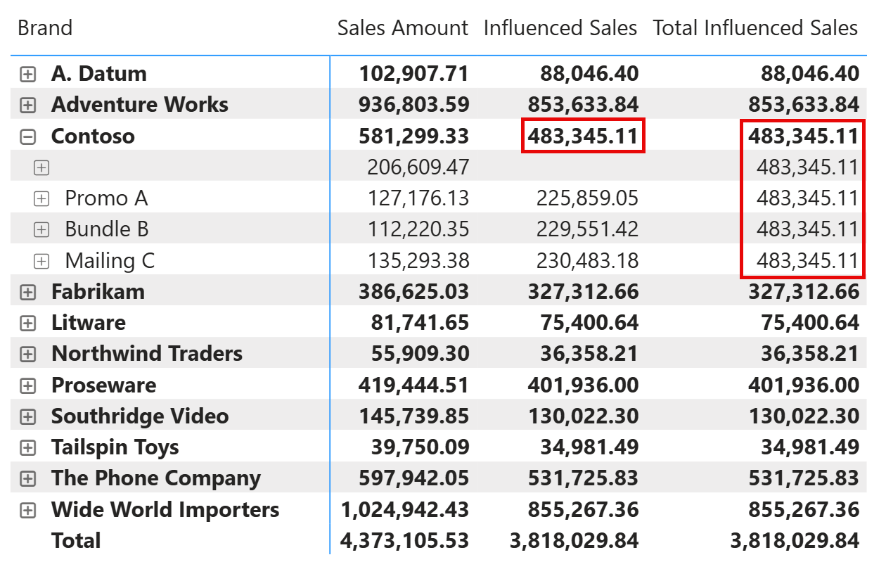 Looking at the Contoso brand, at the brand level, Influenced Sales shows 483,345.11, which is lower than Sales Amount (581,299.33). This is because Influenced Sales only includes products that participate in at least one campaign. Contoso products outside any campaign are excluded.