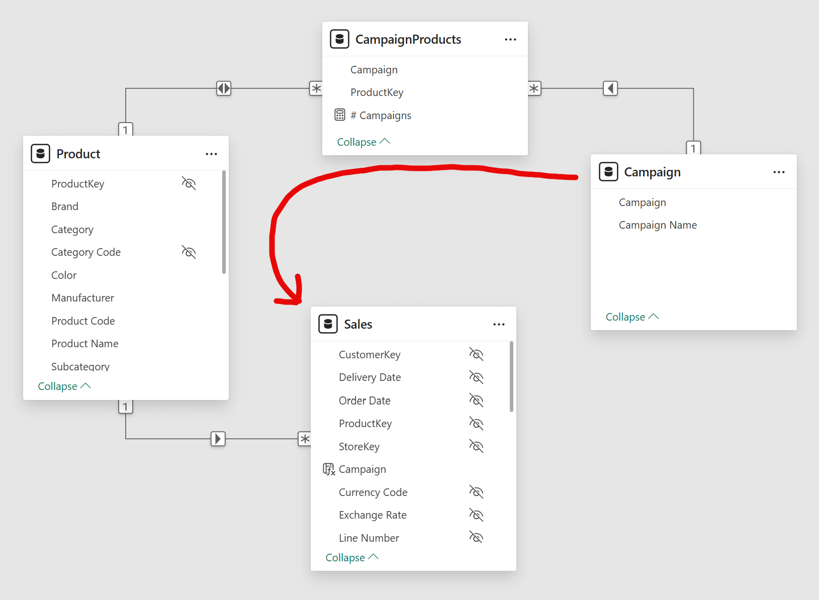 CampaignProducts is a bridge table implementing the many-to-many relationship between Product and Campaign: a product can participate in multiple campaigns, and a campaign can include multiple products. The relationship directions are set to filter from Product to CampaignProducts and from Campaign to CampaignProducts, but not the other way around. This means filtering a campaign does not automatically filter products through the bridge table. The measures we build will selectively activate bidirectional filtering using CROSSFILTER when we need to include all products participating in a campaign, regardless of transaction attribution in Sales.