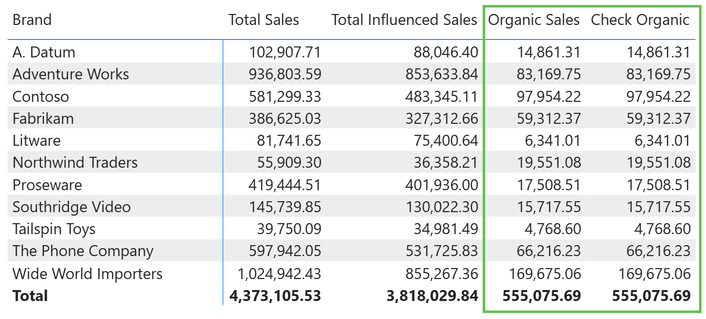 Conceptually, Organic Sales equals the difference between Total Sales and Total Influenced Sales when using additive measures like Sales Amount, as demonstrated in the following report, where Check Organic is computed using a visual calculation: