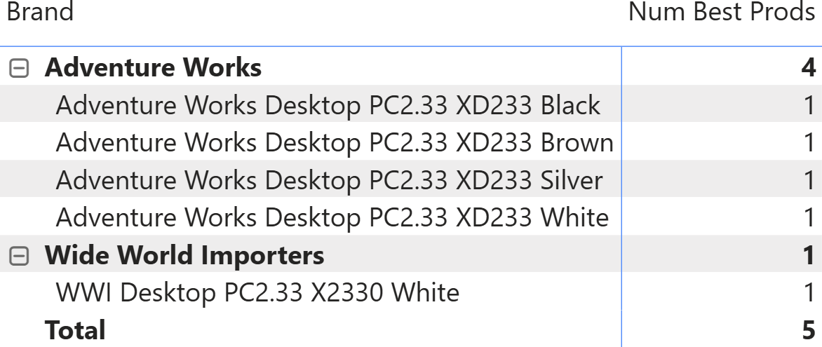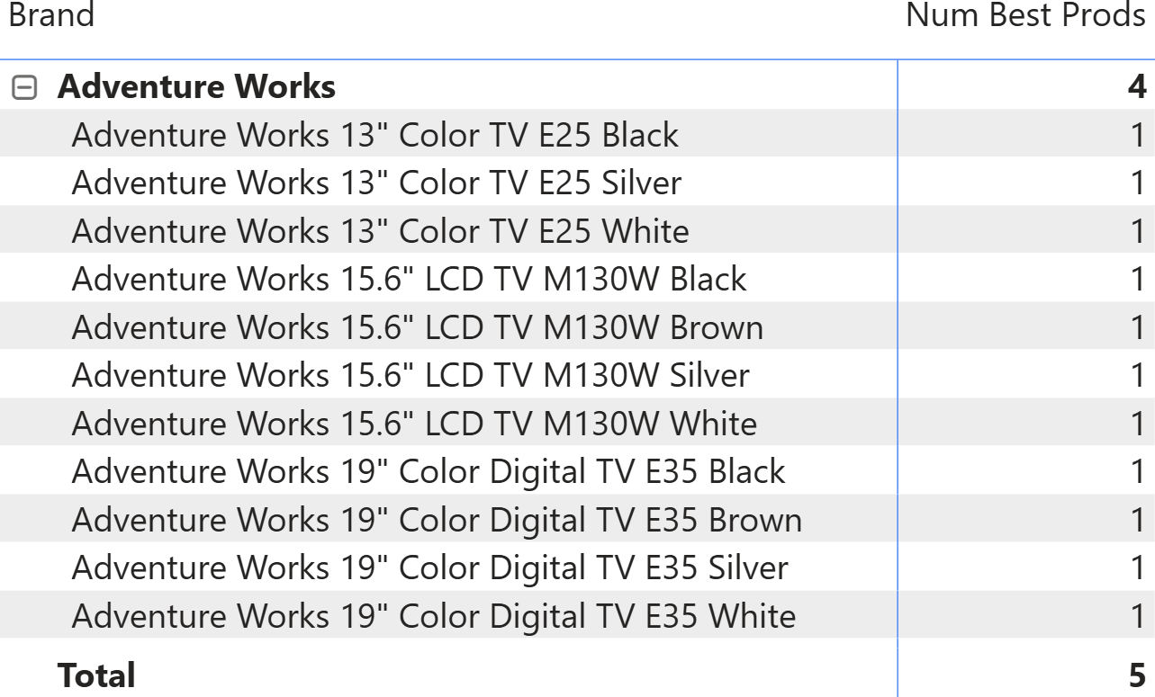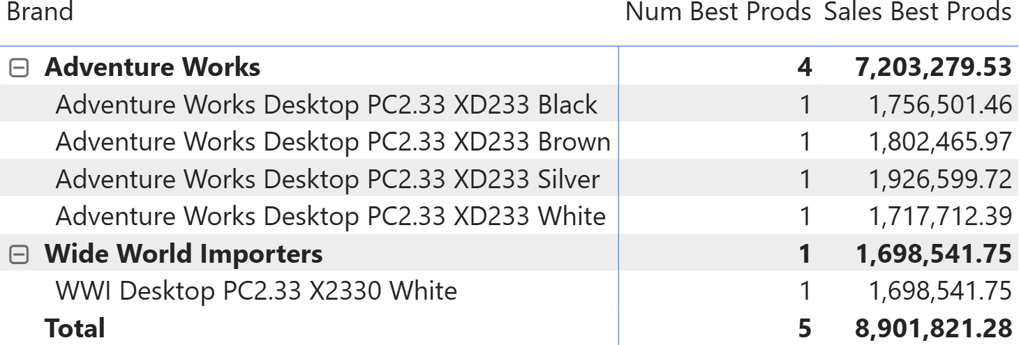 The measure is somewhat complex. And yet, now that users can see the number of best products, it is likely that they are also interested in the sales volumes for those products. Therefore, the best solution is to create a function that receives the measure to compute as an argument, and then returns the computed measure for only the best products.