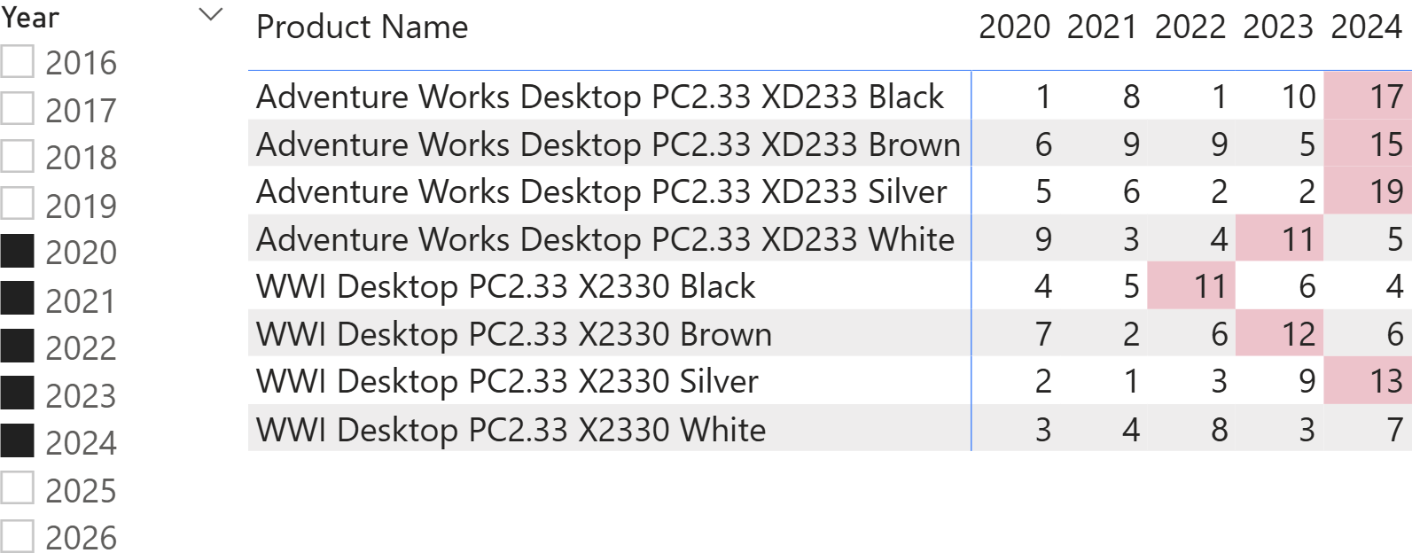 The most significant advantage of using a measure is that its product list is dynamic and can be filtered in the report. For example, the following figure shows the ranking of products by year for 2020-2024. Eight products have appeared in the top 10 for at least 4 years, and only one has always been in the top 10: the last one.