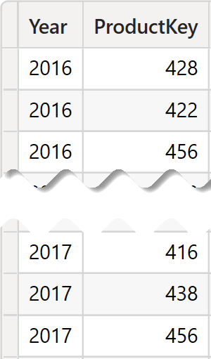Generally speaking, finding the top products requires using GENERATE and TOPN. However, there is an interesting variation of this scenario that solves a specific business problem. Once we have determined the top 10 products by year, we want to filter only those that appear in the top 10 in most years. Obtaining that list of products helps identify evergreen products, that is, the products that remain in the best-seller list consistently.