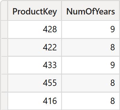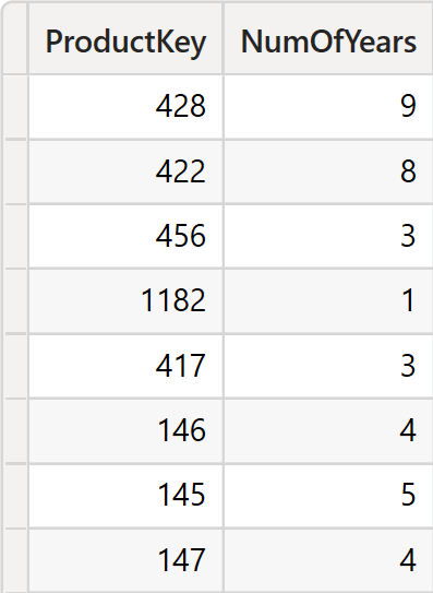 The result of this second step is a table containing the product key and the number of years where the product has appeared.
