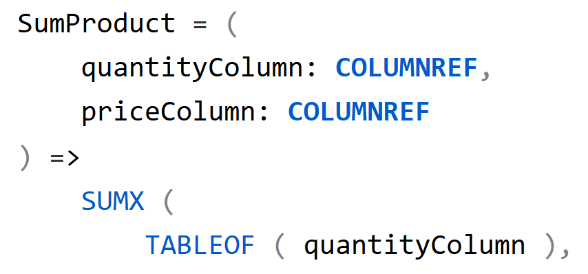 This article describes the parameter types available in DAX user-defined functions, focusing on the specialized reference types MEASUREREF, COLUMNREF, TABLEREF, and CALENDARREF. Read more
